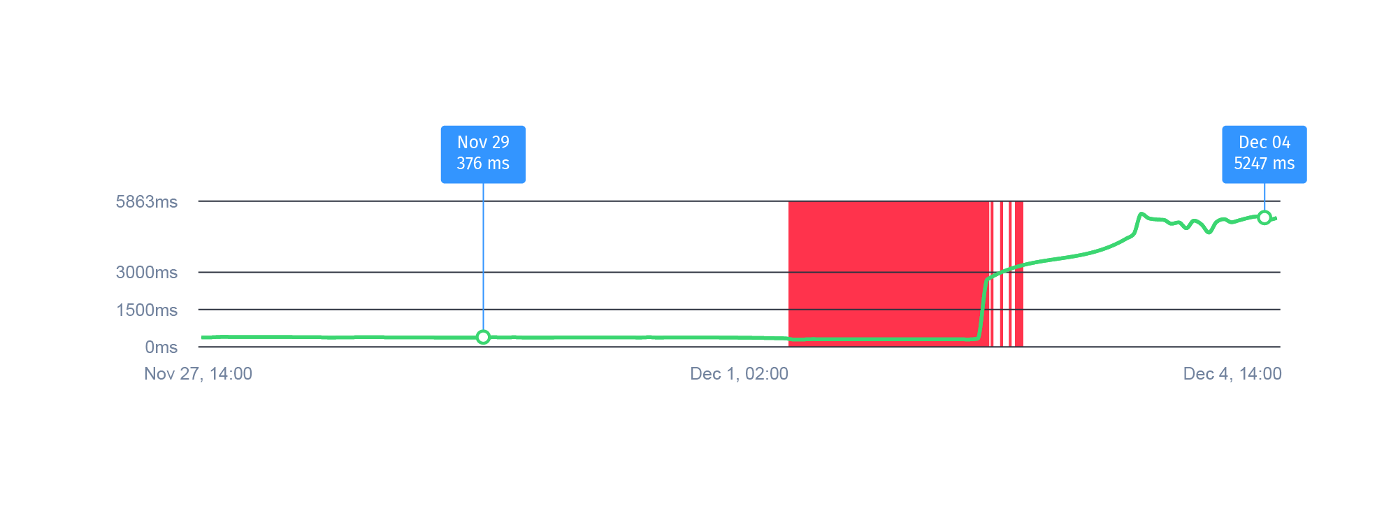 Im ersten Beispiel zeigt die grüne Kurve eine Website, die auf unserem Premium-Hosting-Server mit Ladezeiten von unter 400 ms sehr schnell war. Nachdem der Kunde das Hosting wechselte, gab es zunächst einmal einen Ausfall von mehreren Tagen. Danach stotterten die Ausfälle (rote Balken) noch etwas vor sich hin und hörten dann auf. Die Ladezeit verlängerte sich hingegen massiv um den Faktor 14! Die Website wurde dadurch für Nutzer frustrierend langsam.