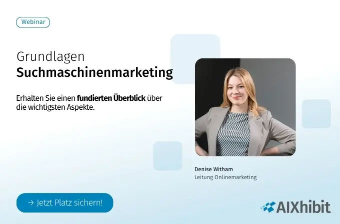 In unserem 1,5‑stündigen Fokuswebinar „Grundlagen Suchmaschinenmarketing“ erhalten Sie von Denise Witham einen fundierten Überblick über die wichtigsten Aspekte des Suchmaschinenmarketings. Dieses Webinar richtet sich an Einsteiger:innen und bietet Ihnen praxisorientiertes Wissen und bewährte Best Practices, um Ihre Onlinemarketing-Strategien zu optimieren.